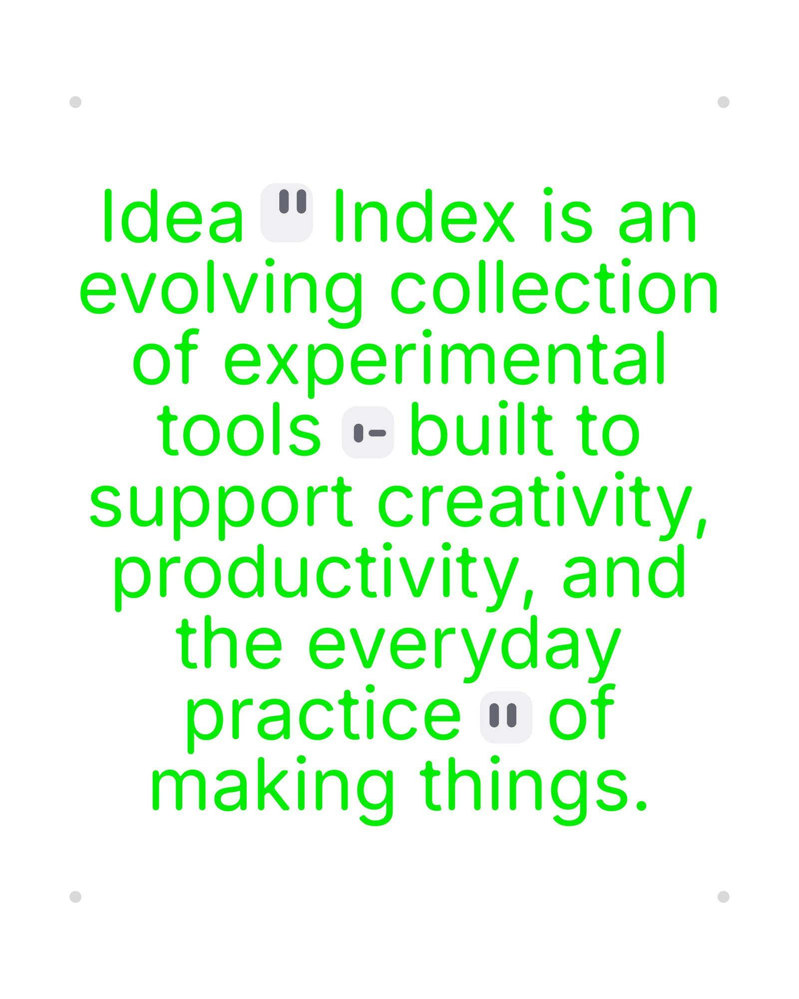 Say hello to Dex. Idea Index is an evolving collection of experimental tools built to support creativity, productivity, and the everyday practice of making things. It sits at the intersection of design and development, offering small systems, prototypes, and platforms that invite people to work, think and create in new ways. Rather than positioning itself as a polished software suite, Idea Index embraces curiosity, treating toolmaking as a form of research and craft. Each project is designed to be adaptable and accessible, encouraging others to learn from it, extend it, or make something entirely new. That's where Dex comes in, a visual representation of the playful nature of this project and the values that we strive to follow in everything we do, Dex shows expressive characteristics, happy, alert, sleepy, always following your cursor, curious in what you do. You can play with Dex in the playground link provided, we have left this project category as Discovery, as a note to ourselves that we are always in beta, and always in discovery.